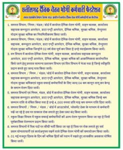 रायपुर / छत्तीसगढ़ राज्य में समस्त विभागों में कार्यरत अनियमित कर्मचारी, जिसमें दैनिक वेतनभोगी कर्मचारी, दैनिक श्रमिक, संविदा, प्लेसमेंट, ठेका, कलेक्टर दर आदि के लाखों कर्मचारी निरंतर अपनी नियमितीकरण की मांग को लेकर आंदोलनरत हैं, दो महिना तीन महिना अनिश्चित कालीन हड़ताल किये हैं।
